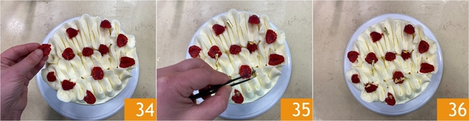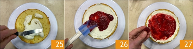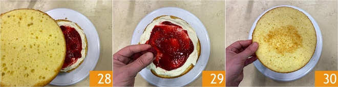 Platzieren Sie einen zweiten Tortenboden darauf 28 und machen Sie noch eine Schicht Creme und eine Schicht Marmelade. Fügen Sie noch einige Himbeeren hinzu 29 und decken Sie mit dem letzten Tortenboden ab, indem Sie ihn umdrehen, so dass die Seite, die auf dem Boden der Backform war, nach oben zeigt 30.