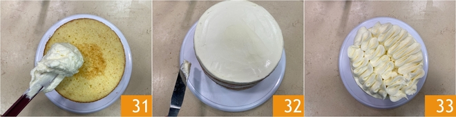 Mit einem Spatel verteilen Sie das Frosting auf der Oberseite des Kuchens 31 und an den Rändern, glätten und glätten Sie es gut, um sie vollständig zu bedecken, aber nur einen Hauch an den Rändern zu lassen 32. Geben Sie die restliche Creme in einen Spritzbeutel mit schräger Tülle und dekorieren Sie die Oberfläche des Desserts 33.