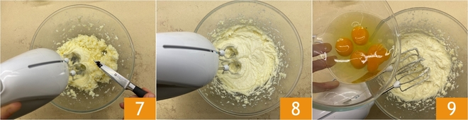 Fügen Sie die Samen hinzu, die Sie aus der Vanilleschote entfernt haben 7, und schlagen Sie weiter 8. Dann fügen Sie nach und nach die Eier 9 hinzu, gefolgt von den beiden Eiweißen.