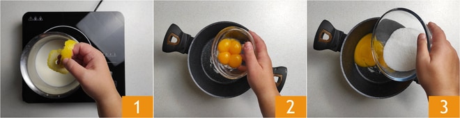 Um die Torte mit Vanillecreme vorzubereiten, stellen Sie zuerst die Vanillecreme her. Gießen Sie die Milch in einen Topf und fügen Sie die Zitronenschale hinzu 1. Erwärmen Sie sie bei schwacher Hitze, bis sie fast kocht, und rühren Sie gelegentlich um. In der Zwischenzeit geben Sie die Eigelbe 2 und den Zucker 3 in einen anderen Topf.