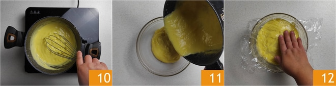 Wenn die Creme eingedickt ist 10, übertragen Sie sie in eine Schüssel 11 und bedecken Sie sie mit Frischhaltefolie, sodass diese die Oberfläche der Creme berührt 12. Lassen Sie sie abkühlen.