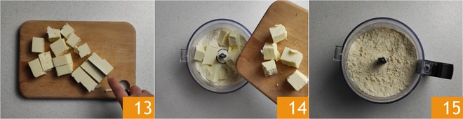 Nun zur Zubereitung des Mürbeteigs: Schneiden Sie die kalte Butter aus dem Kühlschrank in Stücke 13. Geben Sie das Mehl in einen Mixer, fügen Sie die Butter hinzu und mixen Sie in Intervallen, um zu vermeiden, dass die Butter während des Prozesses zu warm wird, bis Sie eine sandige Konsistenz erhalten 15.