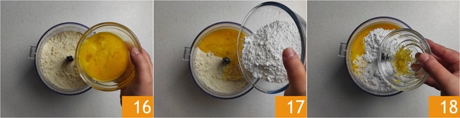 Fügen Sie die Eier 16, den Puderzucker 17 und die abgeriebene Zitronenschale 18 hinzu.
