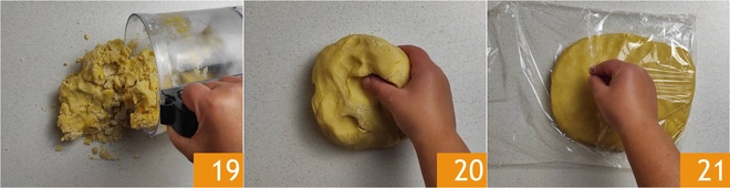 Mixen Sie kurz bei niedriger Geschwindigkeit. Übertragen Sie alles auf eine Arbeitsfläche 19 und arbeiten Sie schnell mit den Händen 20, nur so lange, bis Sie einen homogenen Teigball formen können. Flachdrücken, mit Frischhaltefolie abdecken und mindestens 30 Minuten im Kühlschrank ruhen lassen 21.