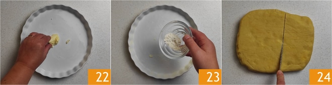 Die Form einfetten 22 und mit Mehl bestäuben 23 mit einem Durchmesser von 24 cm. Nehmen Sie den Mürbeteig aus dem Kühlschrank und verwenden Sie zwei Drittel des Teigballs 24.