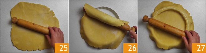 Rollen Sie den Mürbeteig mit einem Nudelholz aus, bis Sie eine etwa 1 cm dicke Platte haben 25. Legen Sie sie in die Form 26, drücken Sie sie an den Rändern an und entfernen Sie den Überschuss, indem Sie mit dem Nudelholz über die Ränder fahren 27.