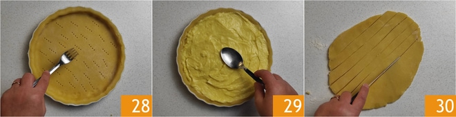 Stechen Sie den Boden mit den Zinken einer Gabel ein 28 und verteilen Sie die mittlerweile abgekühlte Vanillecreme darauf 29. Rollen Sie den restlichen Teig aus, bis er 1 cm dick ist, und schneiden Sie Streifen von 1 cm Breite 30.