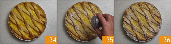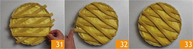 Legen Sie die Streifen auf die Vanillecreme, zuerst in eine Richtung und dann in die andere, um Rauten zu bilden 31, und entfernen Sie den Überschuss 32. Lassen Sie die Torte 30 Minuten im Kühlschrank ruhen 33.