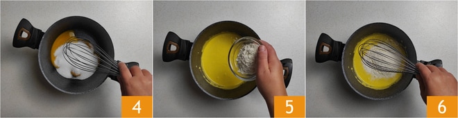 Rühren Sie mit einem Schneebesen, bis eine homogene Mischung entsteht 4. Fügen Sie dann das Mehl hinzu 5 und rühren Sie erneut mit dem Schneebesen 6. Sie sollten eine cremige und glatte Konsistenz ohne Klumpen erhalten.