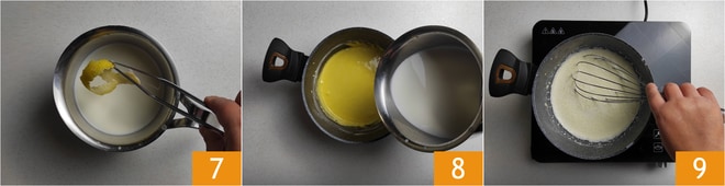 Sobald die Milch fast kocht, entfernen Sie die Zitronenschale 7 und gießen Sie sie in die Eimischung, während Sie mit dem Schneebesen rühren 8. Stellen Sie den Topf zurück auf die Hitze und rühren Sie weiter bei schwacher Hitze 9.