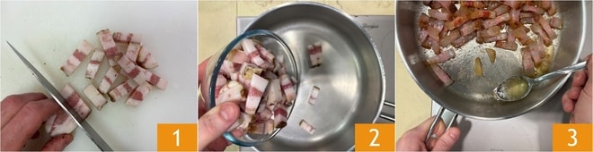 Um die Tortelli alla Carbonara vorzubereiten, beginnen Sie mit der Füllung: Schneiden Sie den Guanciale in Streifen 1, geben Sie ihn in eine Pfanne 2, stellen Sie die Hitze auf niedrig und braten Sie ihn an, bis er goldbraun ist. Während des Kochens sammeln Sie das Fett aus der Pfanne und stellen es beiseite 3.