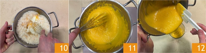 Vermischen Sie alles mit einem Schneebesen 10, dann stellen Sie es wieder über das Wasserbad und kochen Sie es, bis wieder 60° erreicht sind, dabei ständig rühren 11. Sobald die Mischung fertig ist, probieren Sie sie und würzen Sie ggf. mit Salz nach. Übertragen Sie die fertige Creme in einen Messbecher 12.