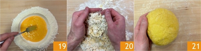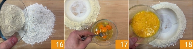 Um den frischen Teig zuzubereiten, geben Sie das Mehl und den Grieß auf eine Arbeitsfläche 16, mischen Sie es und bilden Sie einen klassischen Brunnen. Schlagen Sie die Eier 17 und geben Sie sie in die Mitte 18.