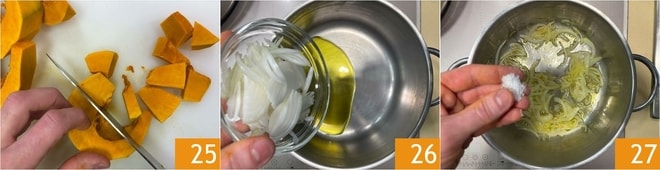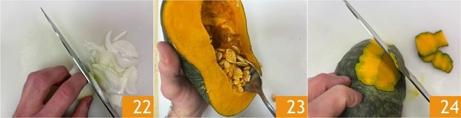 Bereiten Sie die Kürbiscreme vor: Schälen und schneiden Sie die Zwiebel in Julienne 22. Reinigen Sie den Kürbis, indem Sie die Samen 23 und die Schale 24 entfernen.