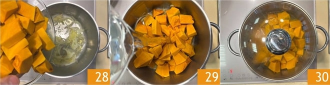 Geben Sie den in Würfeln geschnittenen Kürbis hinzu 28, gießen Sie ein Glas Wasser hinzu 29 und kochen Sie ihn mit Deckel etwa 15 Minuten 30, bis der Kürbis gekocht, aber trocken ist.