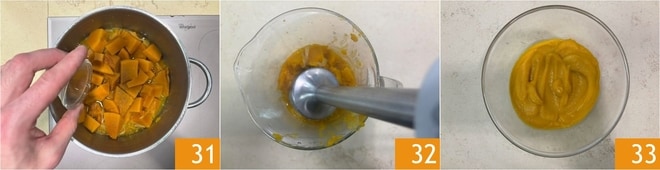 Wenn der Kürbis gekocht, aber trocken ist, mit Essig ablöschen 31, pfeffern und noch 2 Minuten kochen. Pürieren Sie die Mischung mit einem Stabmixer 32, dann passieren Sie sie durch ein Sieb, um eine glatte und seidige Creme zu erhalten 33.