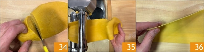 Nehmen Sie den Teig und schneiden Sie ein Stück 34 ab, wickeln Sie den Rest in Frischhaltefolie, um zu verhindern, dass er austrocknet. Rollen Sie den Teig mit einem Nudelholz aus, um ihn dünn genug für die Nudelmaschine zu machen 35. Rollen Sie den Teig mehrmals aus und reduzieren Sie dabei nach und nach die Dicke, bis er fast durchsichtig ist 36.