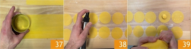 Stechen Sie Kreise mit einem Ausstecher von 8 cm Durchmesser aus 37. Besprühen Sie die Teigscheiben mit Wasser 38 (oder streichen Sie sie mit einem Küchenpinsel ein) und geben Sie einen kleinen Klecks Füllung in die Mitte 39.