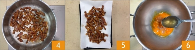 Wenn der Guanciale gut gebräunt ist 4, lassen Sie ihn auf Küchenpapier abtropfen 5. In einer Metallschüssel die Eigelbe, etwas Salz, reichlich Pfeffer und einen Teil des beiseitegestellten Guancialefetts vermengen 6. Stellen Sie die Schüssel über ein Wasserbad auf den Herd.