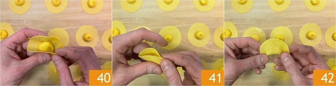 Jetzt formen Sie die Tortelli: Falten Sie die Teigscheiben in der Mitte 40, sodass die Ränder gut haften 41 und Halbmonde entstehen 42.