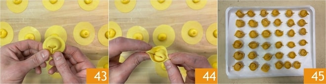 Nun verbinden Sie die Enden 43, indem Sie die Ränder von beiden Seiten zusammenfügen 44. Legen Sie die Tortelli auf ein leicht mit Grieß bemehltes Tablett 45. Mit diesen Mengen erhalten Sie etwa 80 Tortelli.