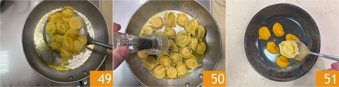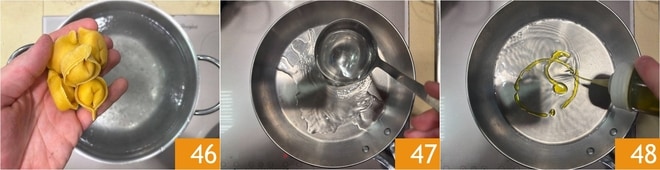 Kochen Sie die Tortelli 1,5-2 Minuten maximal in kochendem Wasser 46. Geben Sie währenddessen in eine Pfanne eine Kelle vom Kochwasser 47 und einen Schuss Öl 48.