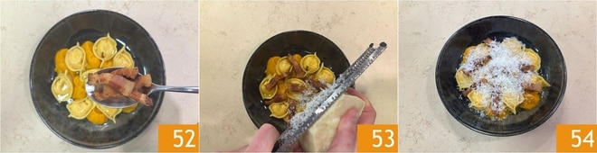 Vervollständigen Sie das Gericht mit dem Guanciale 52 und dem geriebenen Pecorino 53. Servieren Sie Ihre hausgemachten Tortelli alla Carbonara sofort 54!