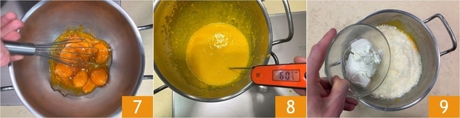 Schlagen Sie mit einem Handrührgerät 7, bis eine dicke Mischung entsteht, die einem Zabaione ähnelt; Sie müssen 60° erreichen, um die perfekte Konsistenz zu erhalten 8. Fügen Sie außerhalb des Feuers den Parmesan, den Pecorino und den Mascarpone hinzu 9.