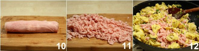 Lassen Sie sie sehr gut abtropfen, achten Sie darauf, sie nicht zu zerbrechen, und fügen Sie sie in der Pfanne mit den Erbsen und dem Lauch hinzu 8. Legen Sie den gekochten Schinken auf ein Schneidebrett 9