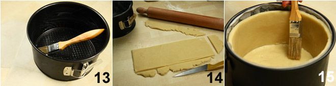 Füttern Sie die gebutterte Springform mit dem rechteckigen Streifen und drücken Sie den Mürbeteig gut an die Form, bedecken Sie den Boden mit einer der beiden Scheiben 15
