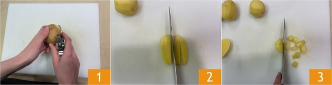 Um die tortilla de patatas vorzubereiten, schälen Sie die Kartoffeln 1, dann schneiden Sie sie in Stifte 2 und schließlich in Würfel von 1 cm 3.