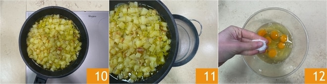Nach 10 Minuten ist die Mischung fast gar 10, nehmen Sie sie vom Feuer und lassen Sie den Inhalt der Pfanne mit einem Sieb ab, wobei Sie das Öl beiseite stellen 11. Lassen Sie die Kartoffeln und die Zwiebeln abkühlen. Inzwischen geben Sie die Eier in eine Schüssel und würzen sie mit Salz 12 und Pfeffer.