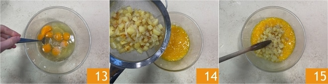 Schlagen Sie mit einer Gabel 13, dann fügen Sie die abgekühlten Kartoffeln und Zwiebeln hinzu 14. Mischen Sie, um die Zutaten zu verbinden 15.