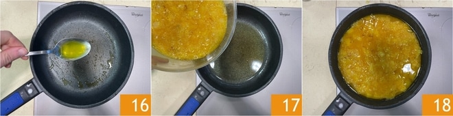 Geben Sie in dieselbe Pfanne das beiseite gestellte Öl 16, dann geben Sie die Eier-Kartoffel-Zwiebel-Mischung hinein 17 18.