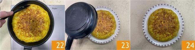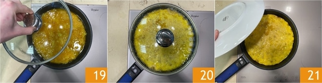 Decken Sie mit einem Deckel ab 19 und kochen Sie bei schwacher Hitze für 16 Minuten 20. Nach dieser Zeit beginnen sich die Ränder von der Pfanne zu lösen, während das Innere noch cremig ist: Es ist Zeit, die tortilla mit Hilfe eines Tellers zu wenden 21.