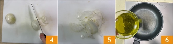 Schälen Sie die Zwiebel und schneiden Sie sie zuerst in Hälften 4 und dann in dünne Streifen 5. Erhitzen Sie gut eine antihaftbeschichtete Pfanne mit einem Durchmesser von 24 cm und geben Sie dann das reichliche Öl hinein 6.