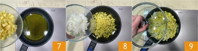 Fügen Sie die Kartoffeln hinzu 7 und braten Sie sie 5 Minuten bei mittlerer Hitze. Nach dieser Zeit fügen Sie die Zwiebeln hinzu 8, decken Sie mit einem Deckel ab 9 und kochen Sie bei schwacher Hitze für 10 Minuten.