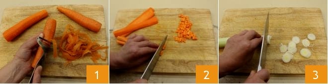 Um die Vollkornküchlein mit Gemüse und Thunfisch zuzubereiten, beginnen Sie mit dem Gemüse, das abkühlen muss, bevor es in den Teig gegeben wird: Schneiden Sie die Enden der Karotten ab und schälen Sie sie mit einem Sparschäler 1, dann schneiden Sie sie in Würfel 2. Schälen Sie anschließend den Lauch und schneiden Sie ihn in dünne Scheiben 3;