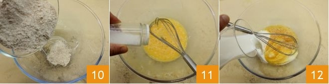 in der Zwischenzeit den Thunfisch in einem Sieb abtropfen lassen, bis Sie 100 g abgetropften Thunfisch erhalten, und 40 g seines Konservierungsöls zur Seite stellen, um es für den Teig der Küchlein zu verwenden. Dann bereiten Sie den Teig vor: geben Sie das Vollkornmehl und das Backpulver für herzhafte Zubereitungen in eine Schüssel 10, in einer anderen Schüssel das Ei verquirlen, salzen 11 und pfeffern und die Milch hinzufügen 12.