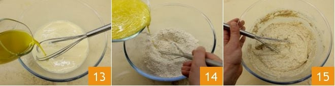 und das Konservierungsöl des Thunfischs (40 g) 13. Alles mit einem Schneebesen verrühren und die Flüssigkeiten nach und nach zum Mehl hinzufügen 14, dabei mit dem Schneebesen rühren, bis der Teig gut vermischt ist 15.
