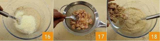 Fügen Sie auch den geriebenen Grana hinzu 16, nehmen Sie den abgetropften Thunfisch 17 und geben Sie ihn in den Teig 18;