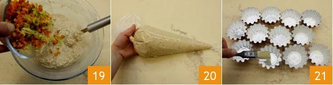 zum Schluss das mittlerweile abgekühlte Gemüse hinzufügen 19. Alles mischen und den Teig in einen Spritzbeutel füllen 20. Die Mini-Muffin-Förmchen einfetten 21 und bemehlen: Wir haben die mit einem Durchmesser von 6 cm an der Oberfläche und einem Fassungsvermögen von 50 ml verwendet, aus Aluminium zum Einmalgebrauch.