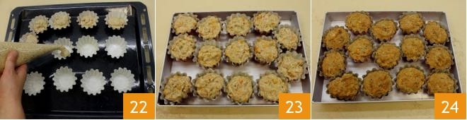 Stellen Sie sie auf ein Backblech und beginnen Sie mit dem Füllen 22, wobei Sie einen Rand von einem halben cm vom Rand lassen, weil sie beim Backen aufgehen werden. Wenn sie fertig sind 23, backen Sie die Küchlein im vorgeheizten statischen Ofen bei 180° für 20-25 Minuten (im Umluftofen bei 160° für etwa 10-15 Minuten). Einmal gebacken 24, aus dem Ofen nehmen und die Vollkornküchlein mit Gemüse und Thunfisch auf einem Gitter abkühlen lassen.