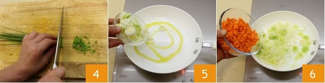 zum Schluss hacken Sie den Schnittlauch 4. Erhitzen Sie in einer Pfanne einen Schuss Öl und dünsten Sie zuerst den Lauch 5, dann geben Sie die Karottenwürfel hinzu 6; kochen Sie etwa 5 Minuten lang