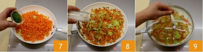 und fügen Sie schließlich den gehackten Schnittlauch hinzu 7. Mit Salz 8 und Pfeffer abschmecken, dann mit einem Deckel abdecken 9 und weitere 5-10 Minuten kochen lassen, dabei gelegentlich umrühren. Wenn das Gemüse fertig ist, nehmen Sie die Pfanne vom Herd und lassen Sie es abkühlen;