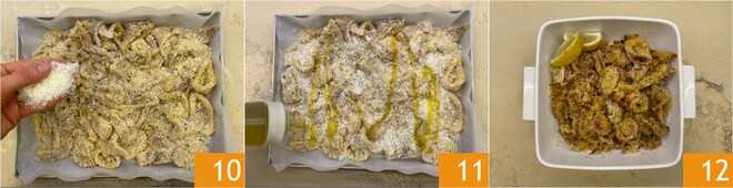 Legen Sie sie auf ein mit Backpapier ausgelegtes Blech, bestreuen Sie sie mit geriebenem Parmesan 10 und beträufeln Sie sie mit Öl 11. Backen Sie sie im statischen Ofen bei 180°C für 20 Minuten, dann im Grillmodus für weitere 5 Minuten. Die Kalmare aus dem Ofen sind bereit, genossen zu werden 12, wenn Sie möchten, können Sie sie nach dem Backen nach Belieben mit Salz würzen.