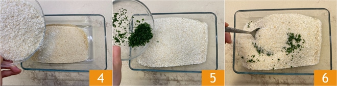 Geben Sie die Semmelbrösel in eine Schüssel, fügen Sie das Panko hinzu 4, den Petersilie 5 und mischen Sie alles 6.