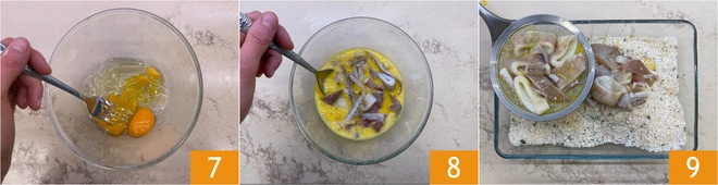 In einer anderen Schüssel schlagen Sie die Eier 7, dann tauchen Sie die Kalmare zuerst in das Ei 8 und dann in die Panade 9.