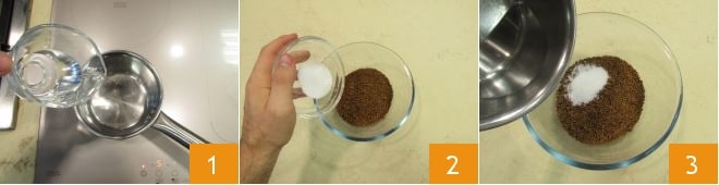 Um den Torrone dei Morti mit Kaffee zuzubereiten, beginnen Sie mit der Kaffeepaste. Gießen Sie 40 g Wasser in einen kleinen Topf und bringen Sie es zum Kochen 1. In einem anderen Behälter geben Sie den löslichen Kaffee und den Zucker 2. Sobald das Wasser kocht, gießen Sie es in die Schüssel 3.