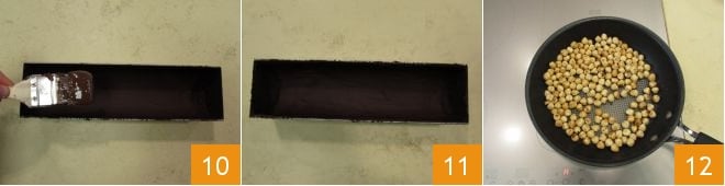 dann nehmen Sie es heraus und pinseln Sie nochmals mit der restlichen geschmolzenen Schokolade, verteilen Sie sie gut mit dem Pinsel (10-11). Stellen Sie es zurück in den Kühlschrank und kümmern Sie sich um den Rest. Rösten Sie die Haselnüsse in einer Antihaft-Pfanne für ein paar Minuten, indem Sie häufig rühren, damit sie nicht verbrennen; stellen Sie die gerösteten Haselnüsse beiseite 12.